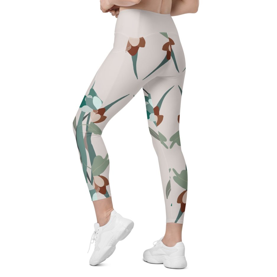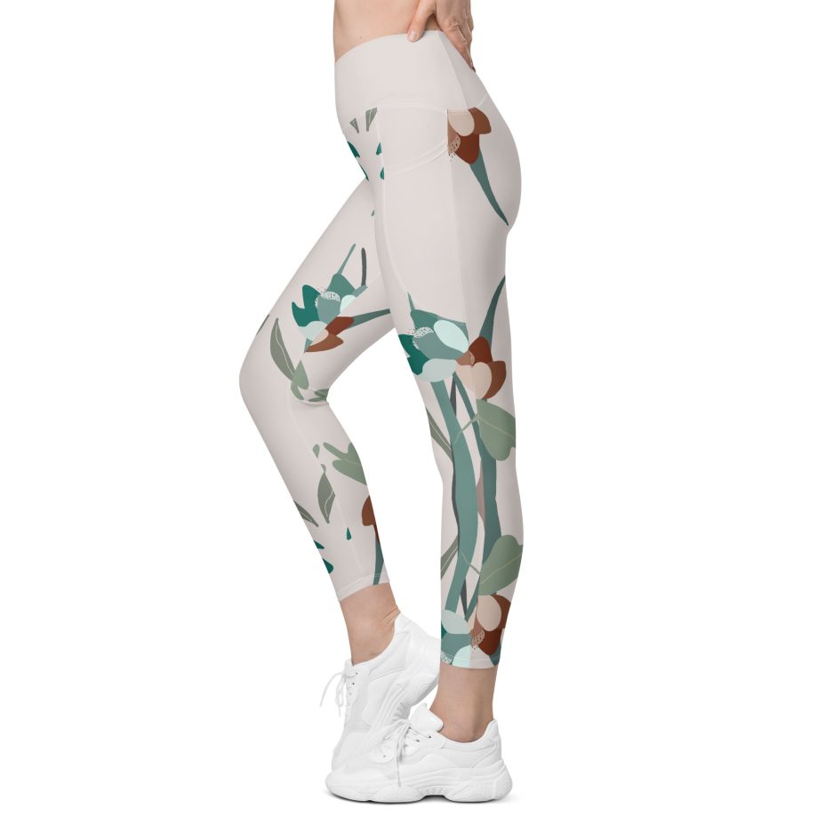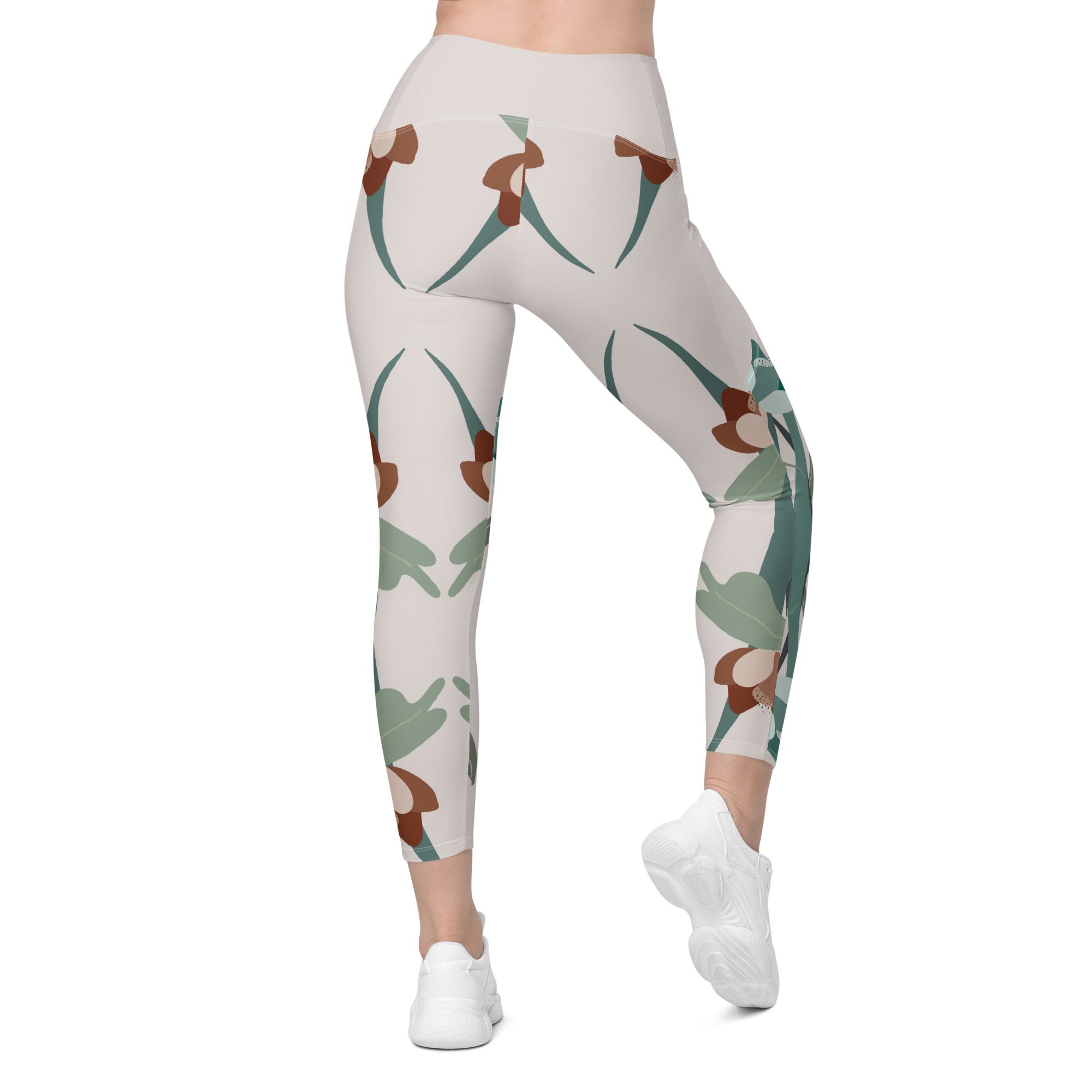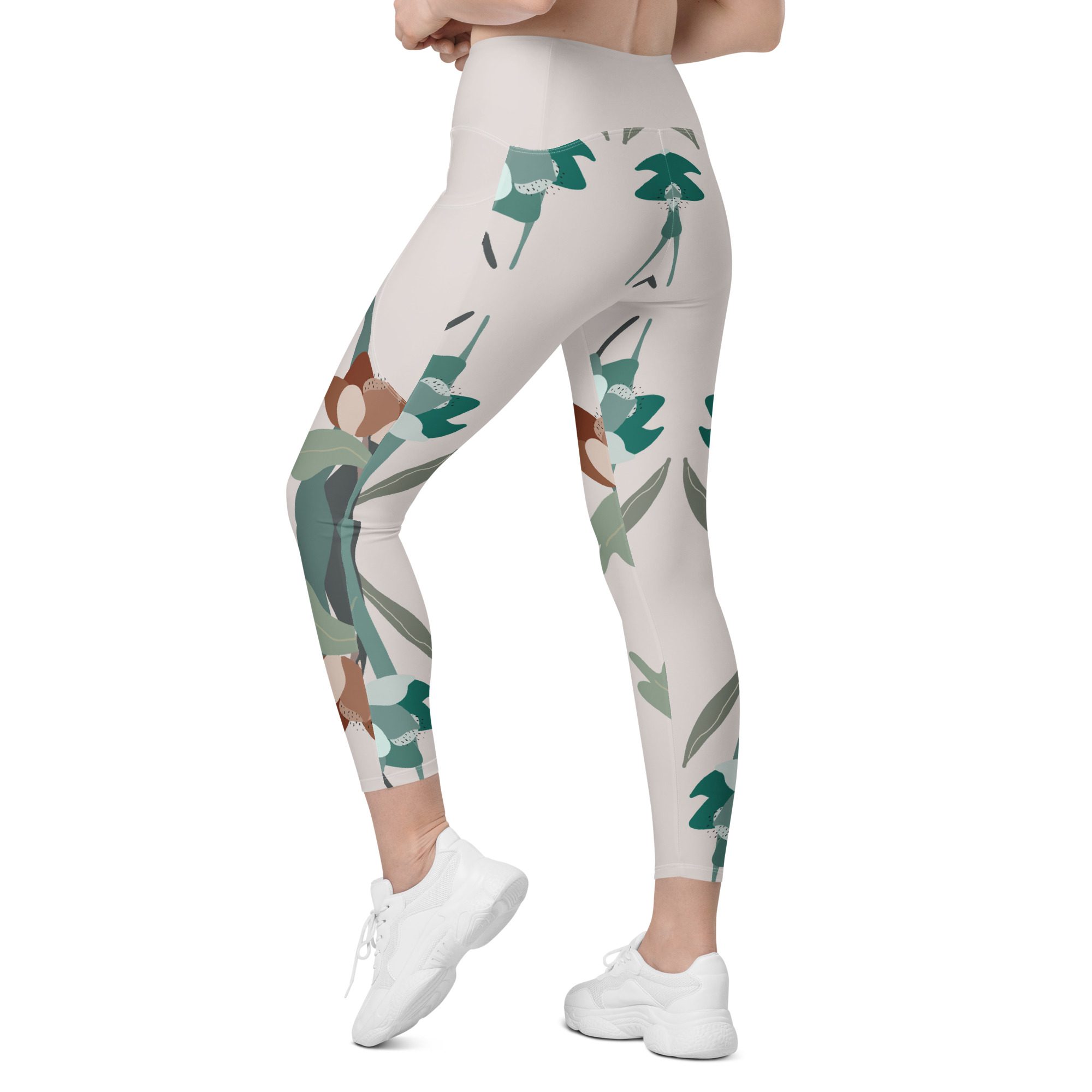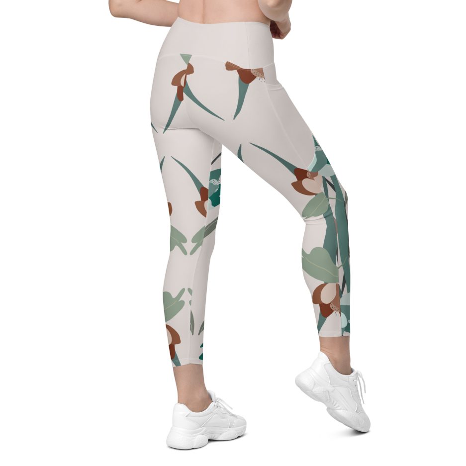 Treat yourself with the trendy and flattering beige colour printed leggings with pockets. Feel exceptional comfort all through your training and keep your valuables close with the practical side pockets.