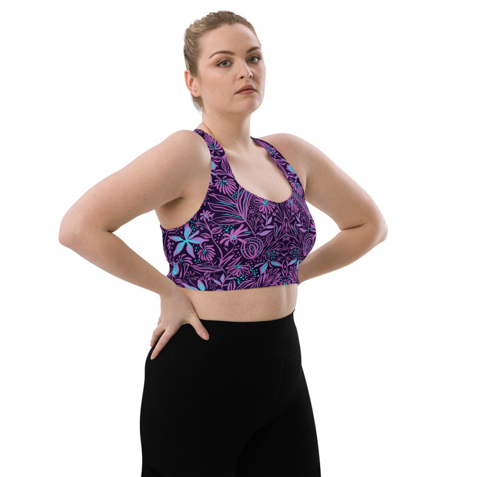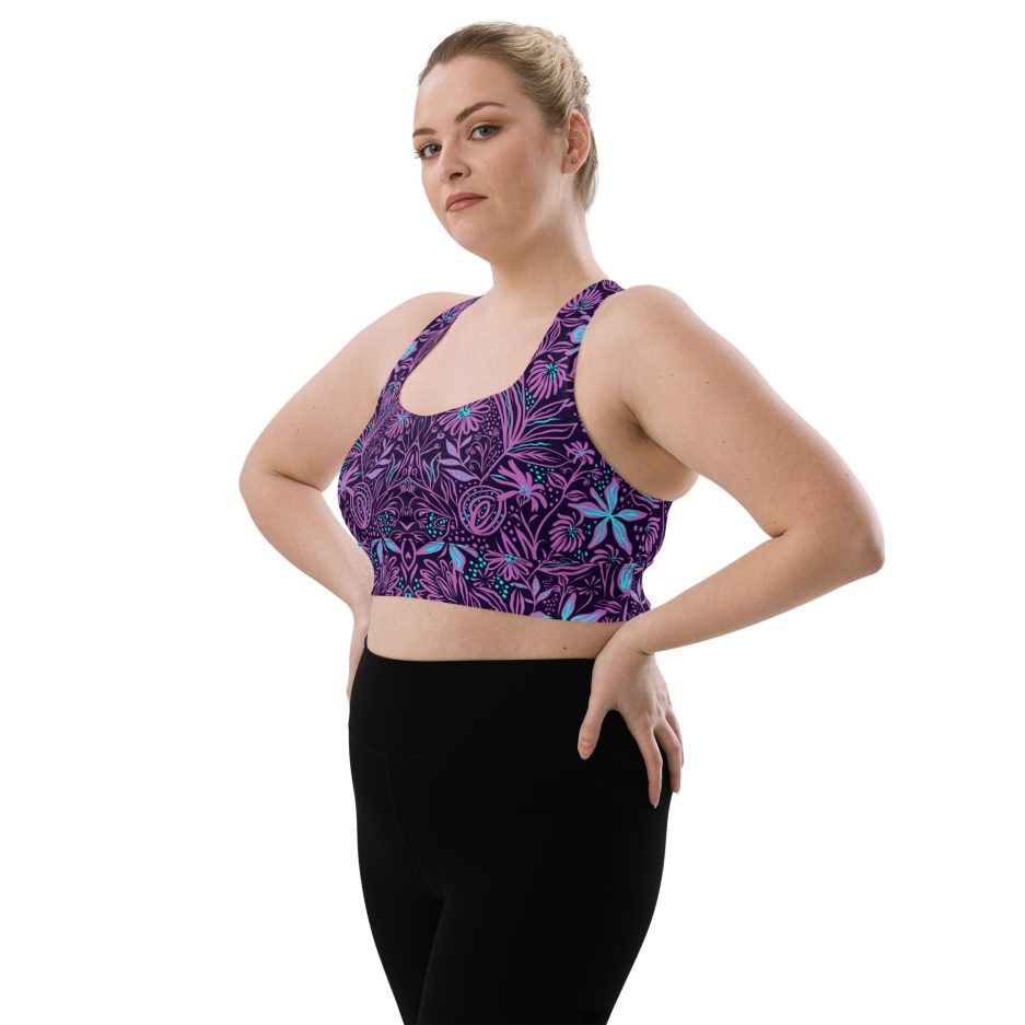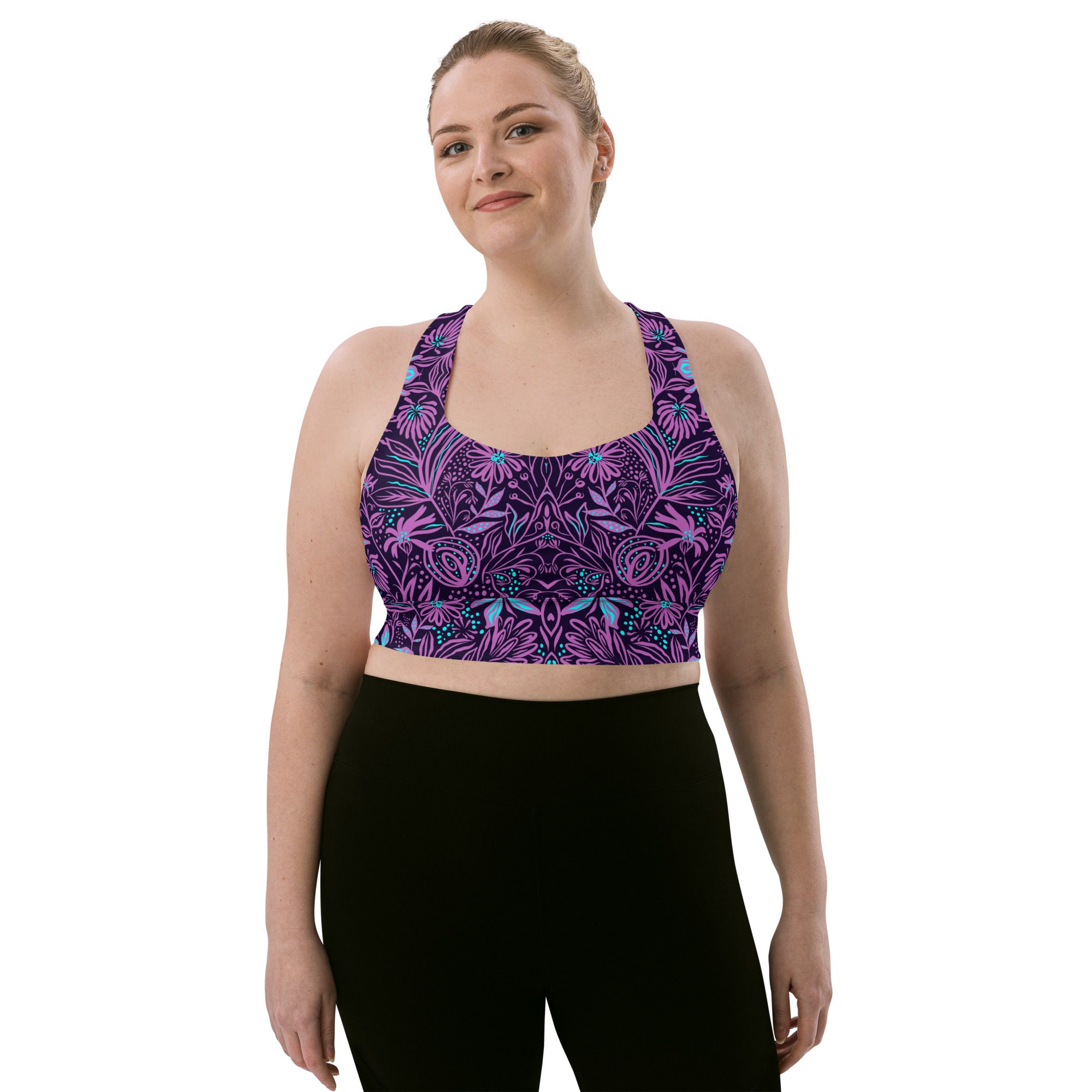 This purple printed sports bra is the perfect workout top for exercising. The compression fabric along with double-layered front and shoulder straps ensures great support while running, jumping, or pumping iron. Wear it while exercising or style it as a streetwear top on sunny days!